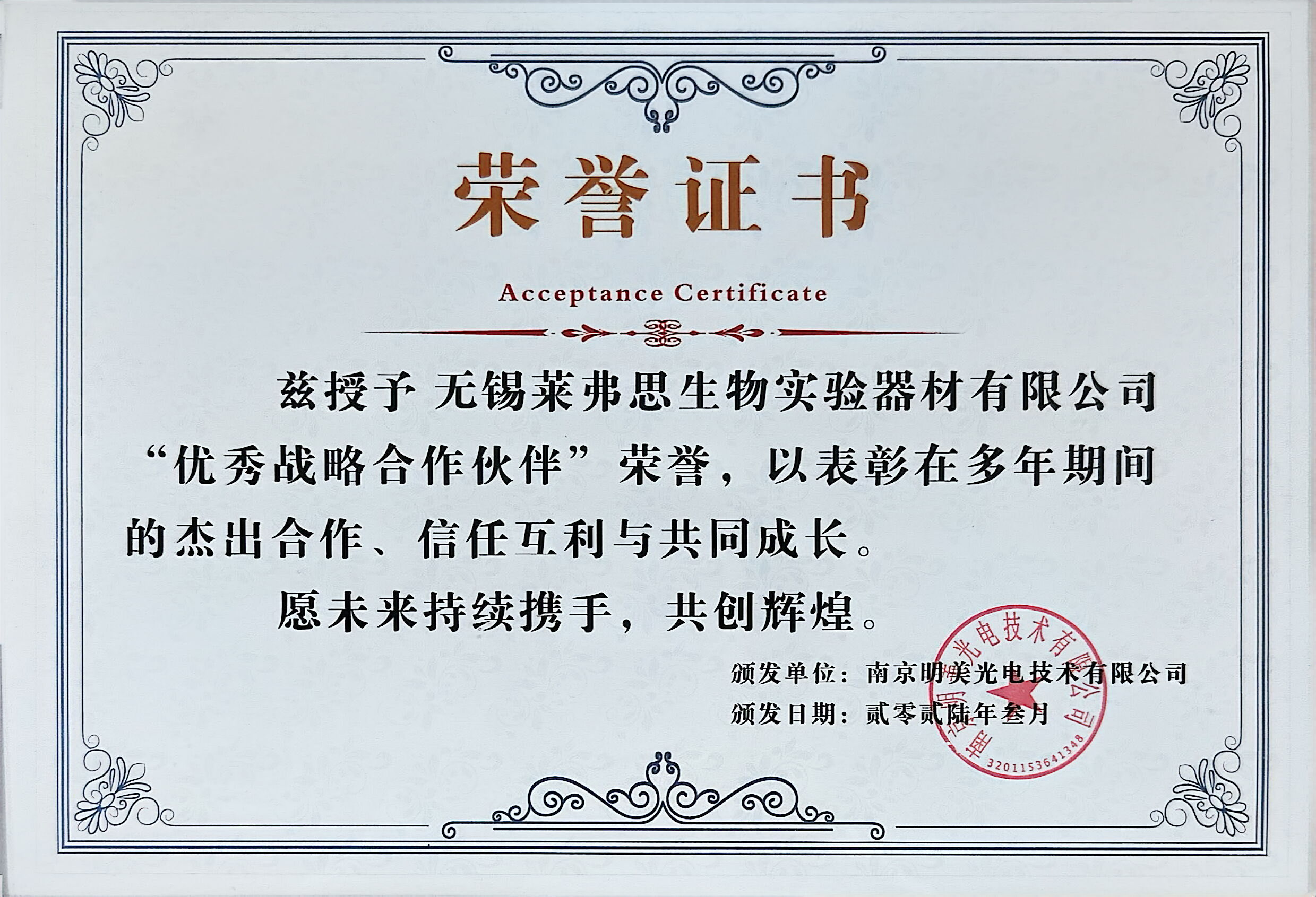 近日,无锡莱弗思生物实验器材有限公司(以下简称为“莱弗思生物”)被正式授牌成为明美光电苏州运营中心,更凭借多年来的深度协同与卓越服务,荣获南京明美光电技术有限公司颁发的“优秀战略合作伙伴”荣誉证书。