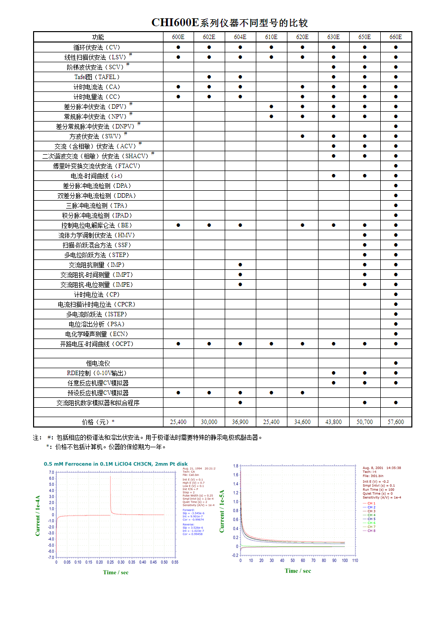 CHI600E系列仪器集成了几乎所有常用的电化学测量技术。为了满足不同的应用需要以及经费条件,CHI600E系列分成多种型号。不同的型号具有不同的电化学测量技术和功能,但基本的硬件参数指标和软件性能是相同的。CHI600E和CHI610E为基本型,分别用于机理研究和分析应用。它们也是十分优良的教学仪器。CHI602E和CHI604E可用于腐蚀研究。CHI620E和CHI630E为综合电化学分析仪,而CHI650E和CHI660E为更先进的电化学工作站。