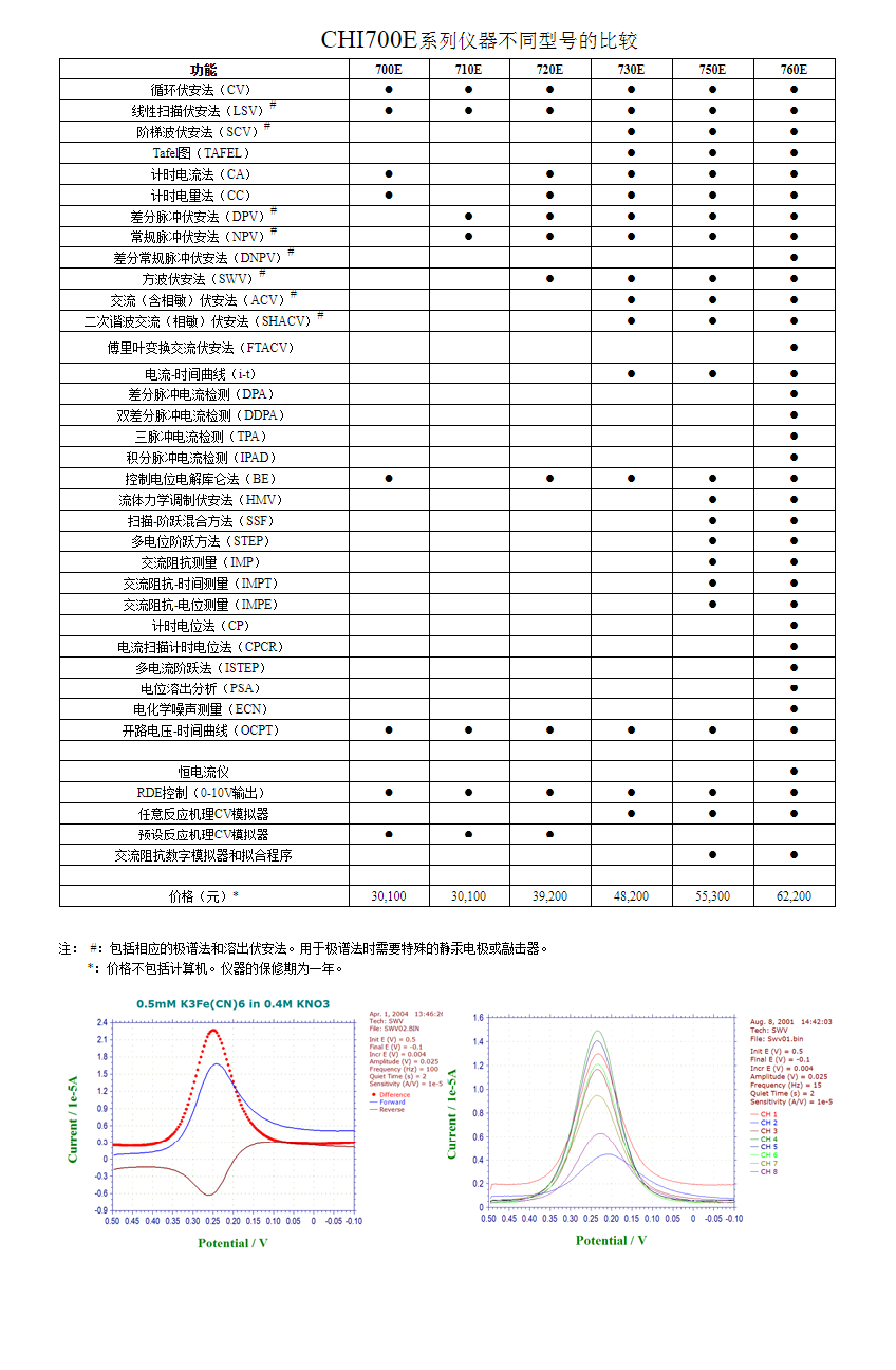 为了满足不同的应用需要以及经费条件,CHI700E系列又分成多种型号。不同的型号具有不同的电化学测量技术和功能,但基本的硬件参数指标和软件性能是相同的。CHI700E和CHI710E为基本型,CHI720E和CHI730E为综合电化学分析仪,而CHI750E和CHI760E为更先进的电化学工作站。